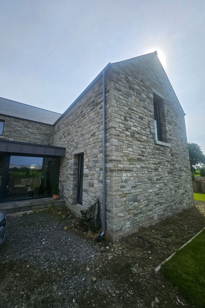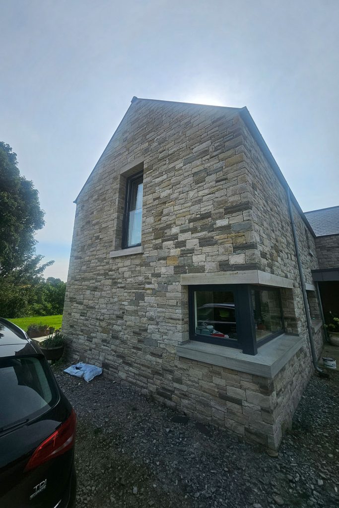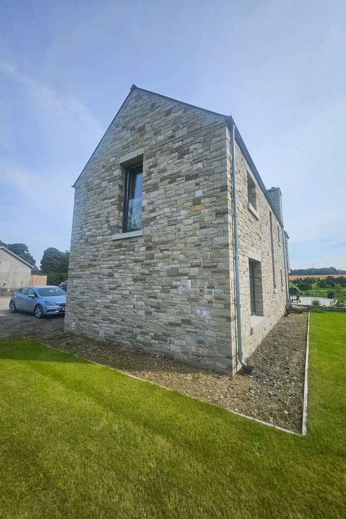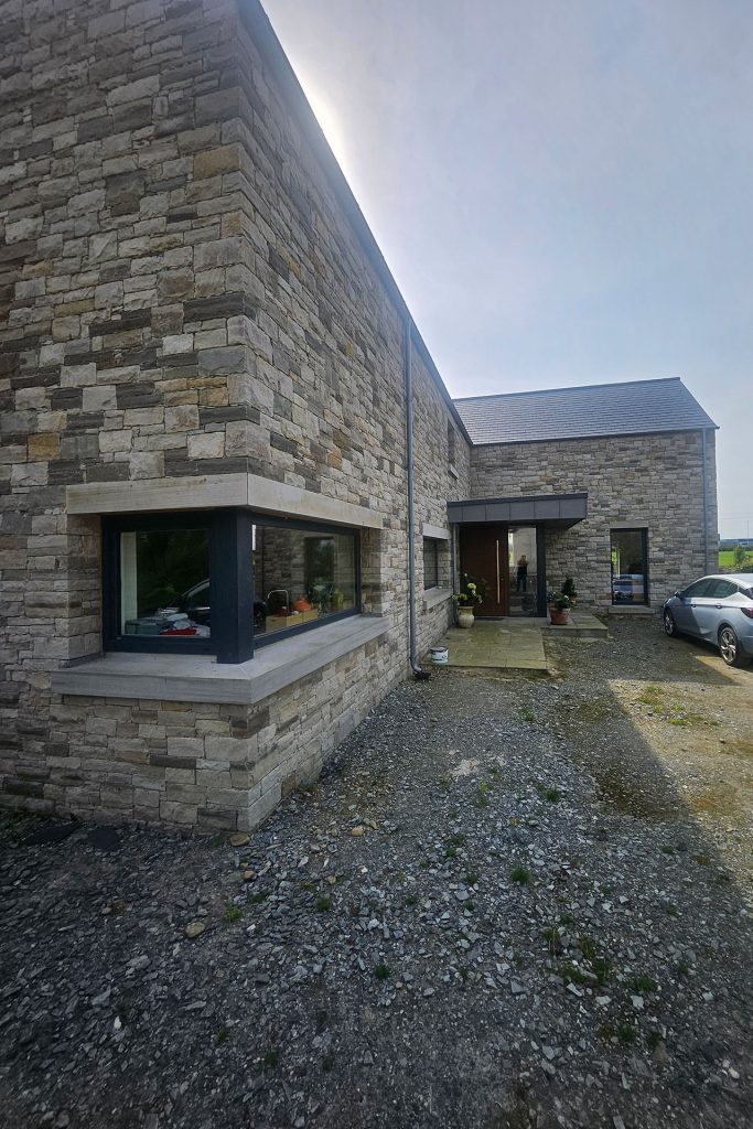 Approaching the house, the warm tones of natural sandstone immediately convey a sense of subtle elegance. Floating-style lintels above all openings and matching sandstone sills lend refinement, while the material palette ties the home seamlessly to its rural context. The two-storey form is deliberately articulated to mediate between the activity of the farmyard and the calm of private family spaces, offering both presence and discretion.