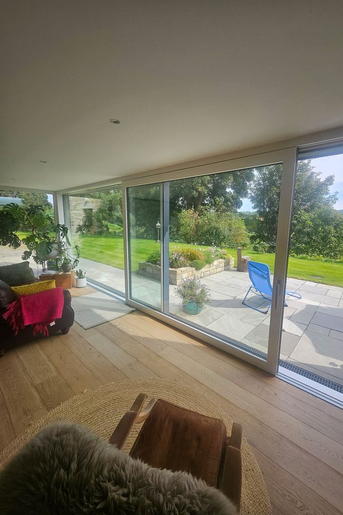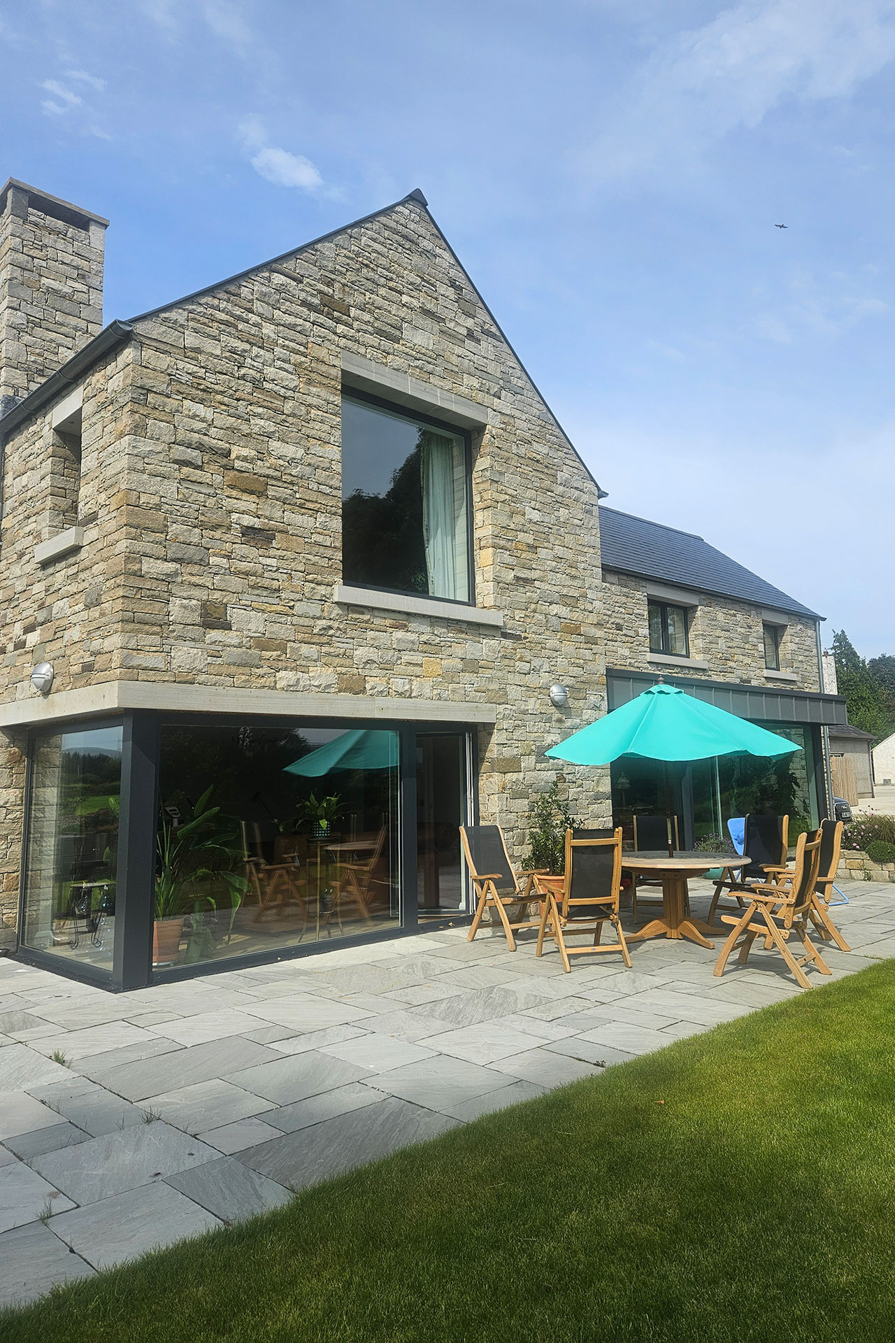 Inside, expansive corner windows at the rear frame panoramic vistas, flooding the interiors with natural light and providing a constant visual connection to the landscape. These windows open onto a secluded family patio, tucked away from the farm shop, yard, and the main Clooney A2 road—a quiet sanctuary where the family can relax and entertain. The positioning of the home, its openings, and outdoor spaces was carefully considered to capture sunlight, maximize views, and ensure privacy without isolating the dwelling from its surroundings.